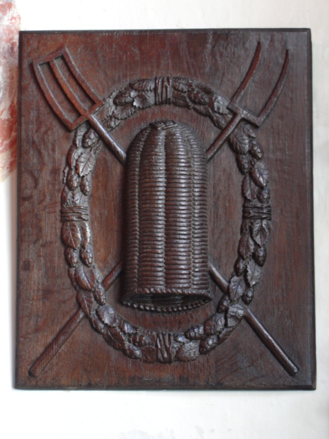 | Houten paneel met brouwersembleem in de werkplaats van het Brouwershuis. Foto Bart Huysmans & Michel Wuyts. |